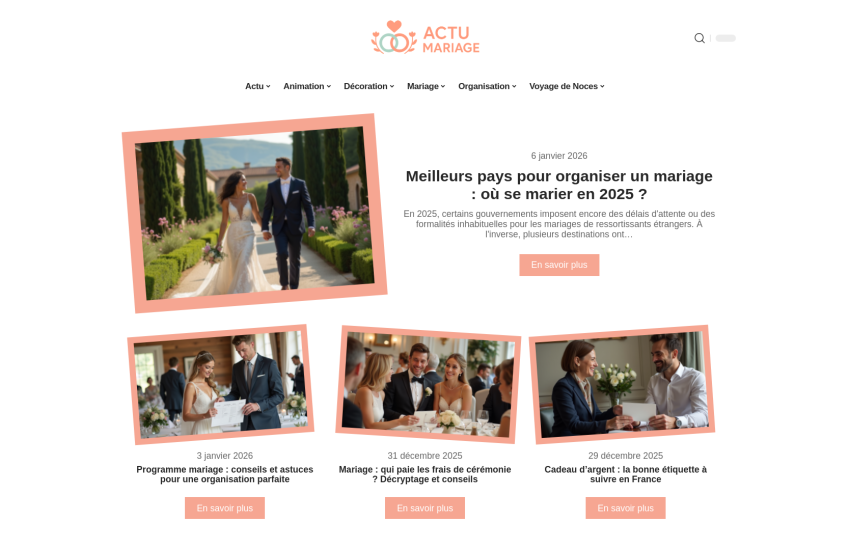 actu-mariage.fr Site web : www.actu-mariage.fr Lune de miel en hiver : Mussoorie, destination idéale ? Mariage mots de félicitations : exemples élégants pour tous les styles Coût d’un nœud pour fonds de lune de miel : tarifs et considérations financières Mariage : quelles lois encadrent cette union ?